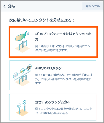 インポート以外と判定されたアクションの次は最新トラフィックソースの値毎にアクションを分岐させます。まずは「1件のプロパティーまたはアクション出力」を選択します。